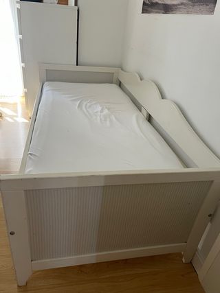 EDITO: EL precio es por solo una cama con su somier,dos por 180 €. Tengo dos camas, dos colchones y las extensiones, según lo que te lleves pactamos un precio. Están nuevas, no tienen ni un solo signo de uso. En ikea dos por 320€ mas los colchones. Una cama que crece con tu hijo y se adapta a sus cambios de gusto. Puedes alargarla y sustituir el cabecero todas las veces que quieras. El colchón mide 80x130 cm y la cama se puede extender hasta 165 cm en la posición intermedia y 200cm en la final por lo que sirve hasta para cama de invitados ya que ocupa poco y es muy cómoda. Tengo los colchones y las extensiones, están