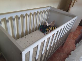 Cuna de bebé de la marca Ikea, con unas medidas de 60x120 cm. colchón incluido, con apenas uso ya que ha estado en contadas ocasiones protectores de cuna, se incluyen 2, uno de ellos de rejilla 3D, todo en perfecto estado, como nuevo. juego de sábana blanco con estrellitas en perfecto estado. TODO practicamente NUEVO