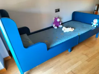 Cama extensible para niños en color azul, modelo Ikea Busunge. - Estructura de madera. - Diseño moderno y seguro. - Incluye colchón (opcional)