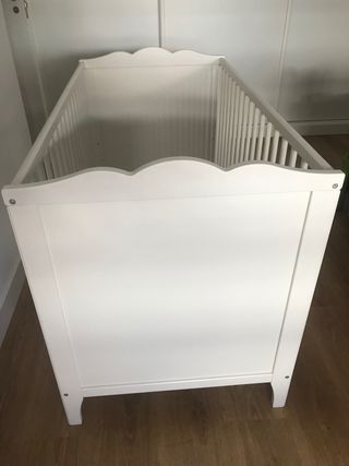 Cuna de Ikea modelo Hensvik blanca. Regulable a dos alturas. Medidas: longitud 123cm Ancho 66cm Altura 85cm. Se entrega desmontada.