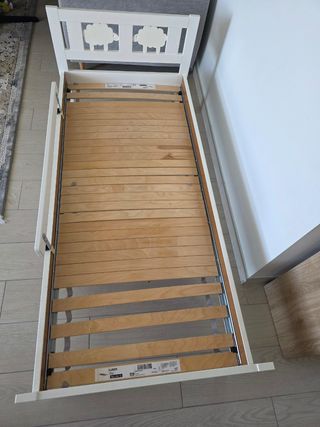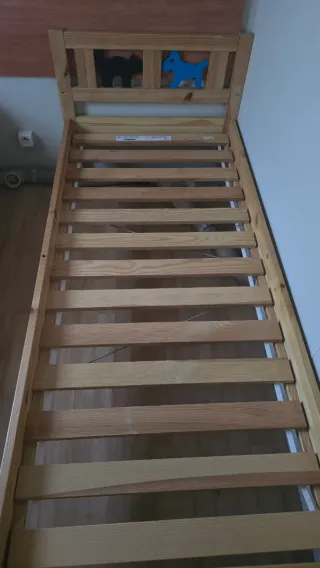 Cama infantil de IKEA modelo KRITTER Incluye: 1. Con más de 14 tablillas de láminas encoladas de abedul que se adaptan al peso del cuerpo y aumentan la flexibilidad del colchón (en total 28 tablillas de láminas). 2. Un protector de colchón modelo LENAST. 3. Un colchón modelo UNDERLIG. En condiciones excelentes y muy limpio.
