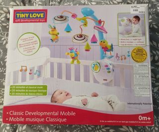 En venta en Barcelona ciudad o Palamós. El móvil de desarrollo Classic de Tiny Love, dispone espirales blancas y negras para el desarrollo visual. El móvil tiene opción de dar vueltas para distraer al bebé. Incorpora 3 melodías clásica y luz nocturna. Va con pilas. A partir de los 5 meses funciona como caja de música independiente. Se adapta a cunas con barandillas con total seguridad. Embalaje original. Se monta y desmonta con facilidad.