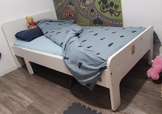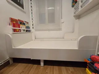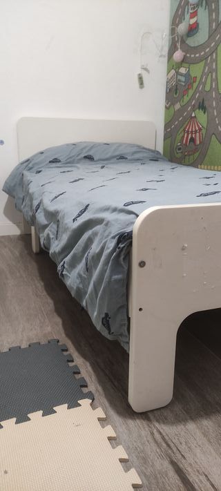 Cama infantil extensible de IKEA modelo SLÄKT en perfectas conditiones. Colchón incluido, en buen estado pero un lado está degastatado. Cama y colchón se adaptan al crecimiento del niño. - Longitud extensible: 135 cm a 205 cm. - Altura del cabecero: 71 cm. - Anchura del cabecero: 91 cm. - Incluye piezas de extensión. - Incluye somier y colchon adaptable