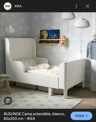 Cama infantil extensible de IKEA, modelo Busunge. Su diseño moderno y adaptable la hace perfecta para habitaciones infantiles. - Estructura blanca. - Diseño con cabecero y piecero curvos. - Incluye somier -Incluye colchón adaptado a la cama