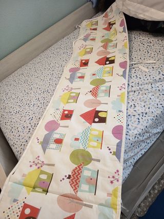 Vendo chichonera con dibujos de casitas. Perfecta para proteger la cuna. A juego , vendo el edredón, calentito. - Diseño infantil con estampado de casas de colores. - Confeccionada con tejido suave y agradable al tacto. - Se adapta a cualquier de cunas estándar. Lleva cuerdas para agarrarlo a los barrotes dela cuna .