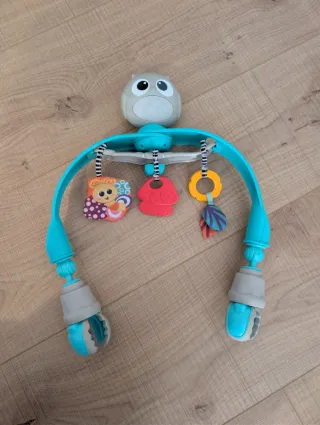 Móvil musical versátil que se adapta tanto a la cuna como al carrito de bebé. Su diseño es alegre y colorido. - Incluye un simpático personaje de búho. - Cuenta con varios juguetes colgantes. - El arco es de color turquesa. - Las pinzas de sujeción son grises y turquesas.