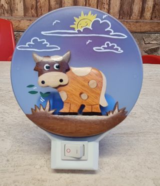 Luz nocturna con un diseño moderno y atractivo, ideal para habitaciones infantiles. Su forma circular y el detalle azul le dan un toque especial. - Incluye adaptador para enchufe. - Diseño con forma de Vaquita y disco azul.