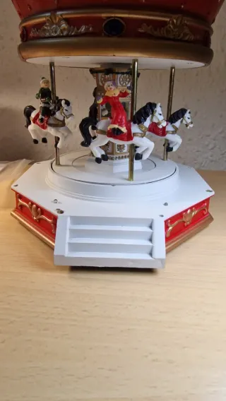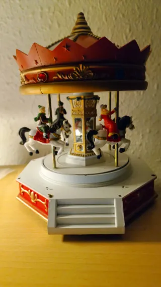 Carrusel musical decorativo con figuras y luces. - Diseño festivo con caballos. - Incorpora luces para un ambiente especial. - Con pilas no funciona - No tengo el adaptador de luz