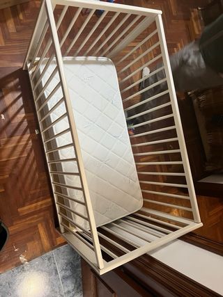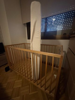 Cuna de madera + colchon practicamente nuevo de IKEA, ideal para habitaciones infantiles. Su diseño sencillo y natural encaja en cualquier decoración. - Fabricada en madera clara haya. - Barreras de seguridad.