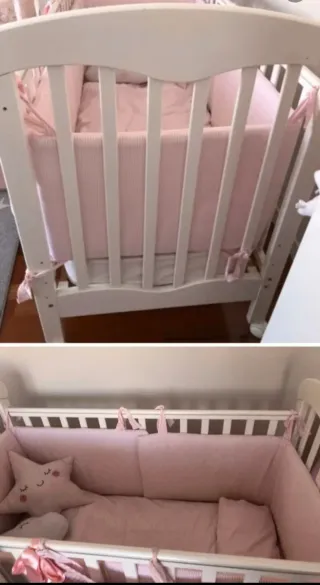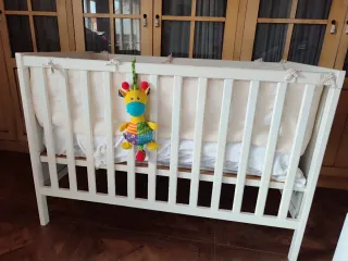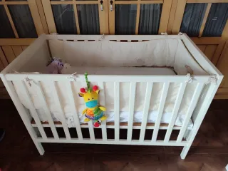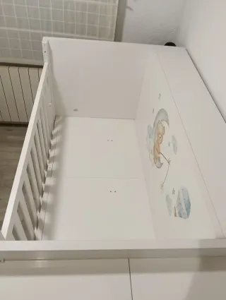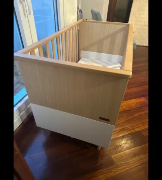 Se encuentra en muy buen estado, poco uso y perfectamente funcional. Medidas de colchón: 70x140 cm. Estructura robusta y estable, fabricada en madera con acabados lacados de alta calidad. Dispone de laterales fijos seguros y somier regulable en altura para adaptarse al crecimiento del bebé. Convertible a cama infantil, lo que alarga su vida útil más allá de la etapa de cuna. Se vende con colchón nuevo incluido sin usar y cambiador a juego. Fácil montaje y limpieza. Se vende por falta de uso y mudanza. Las pegatinas son fáciles de despegar, en el momento de venta las retiro y la limpio.