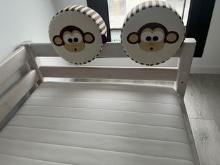 Cama infantil de madera de la marca FLEXA, ideal para habitaciones de niños. - Estructura de madera. - Dos cojines decorativos con diseño de monos. - Incluye colchón (90 x 200 cm) Se puede recoger en Madrid (zona norte) y en Colmenar Viejo