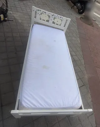 Cama infantil de madera pintada en blanco. Incluye colchón. 146cm Largo 75cm ancho 42cm alto - Estructura de madera. - Colchón reversible, una cara verano otra cara invierno. - Diseño sencillo y seguro.