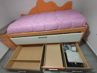 Cama nido con un diseño infantil y práctico, ideal para habitaciones de niños. - Incluye dos colchones. - Estructura de madera. - Cajones de almacenamiento integrados.