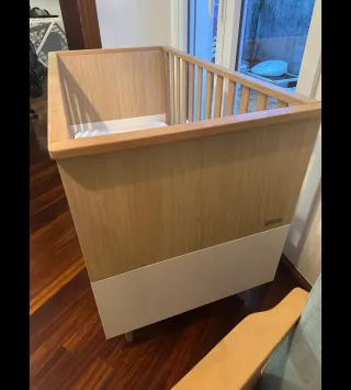 Cuna de bebé en perfecto estado, casi sin uso. Combina un diseño moderno en madera clara y blanco. - Estructura de madera. - Base en color blanco. - Incluye colchón.