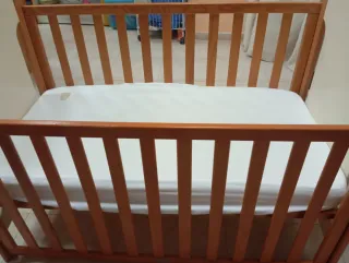 Cuna de madera de pino, con un diseño sencillo y funcional. Perfecta para habitaciones infantiles. Nosotros le sacamos un lateral (cómo en las fotos) para hacerla colecho) sino tiene los 4 lados. Se vende desmontada. Solo venta en persona. - Medidas: 60x120 cm. - Material: Madera de pino. - Base de tablero aglomerado. Precios: Solo estructura (Ikea): 25€ Solo colchón (carrefour): 30€ Ambos: 50€