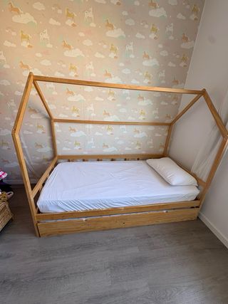 Cama infantil de madera con un diseño de casita. El precio es la estructura de madera. Con el colchón también serían 100€(Está nuevo)
