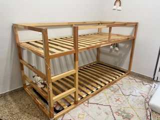 Litera de madera modelo Kura de Ikea. Ideal para optimizar el espacio en habitaciones infantiles. - Estructura de madera. - Somier de lamas incluido. Tengo las lamas de las lamas de los laterales.