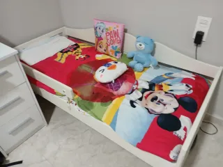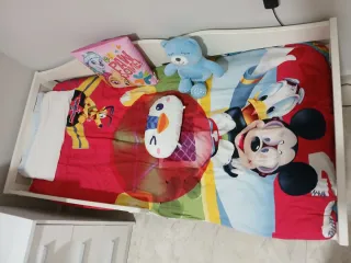 Cama infantil de Ikea, ideal para habitaciones de niños. Su diseño es sencillo y funcional. - Estructura de madera lacada en blanco. - Barrera de seguridad para evitar caídas. - Incluye colchón y ropa de cama con personajes infantiles.