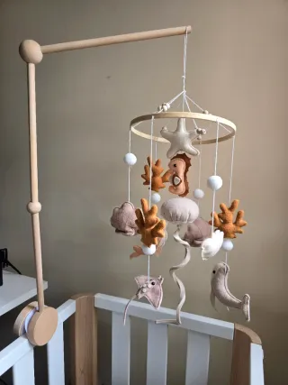 Móvil de cuna hecho a mano con figuras del mar. Hecho en fieltro con pie de madera ajustable. - Diseño de temática marina con estrellas de mar, corales, medusas y peces. - Materiales de fieltro y madera. - Colores neutros y suaves.