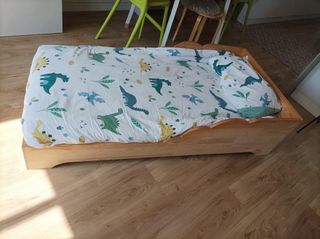URGE VENDER, ACEPTO OFERTAS Cama infantil con estructura de madera en forma de casita. Las medidas son 90x160, ideal como primera cama. - Estructura de madera natural. - Diseño de casita. Incluye: - Colchón Ecus care - Funda nórdica tipo saco con estampado de dinosaurios - Relleno nórdico 4 estaciones - Protector de colchón - Almohada Tanto la cama como el colchón están en muy buen estado ya que no ha dormido en ella, preferiría la cama de los papis. El único desperfecto que tiene es que se levantó un poquito de madera, se ve en la última foto. Esa parte de la cama es la que queda contra la pared y no se ve