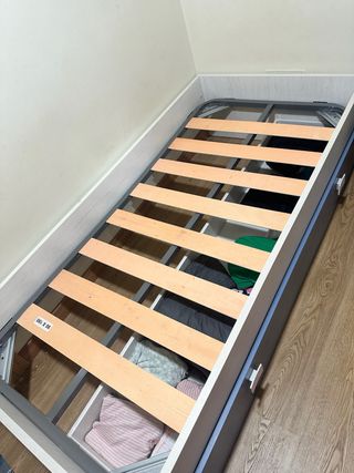 Cama infantil en buen estado. blanco y azul , Incluye estructura de cama y cajón con espacio de almacenaje. - Estructura de madera y metal. - Cajón amplio para almacenar. - Perfecta para habitaciones pequeñas. - Módulo: 200x100x73 - Somier de láminas y colchón