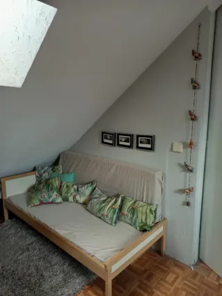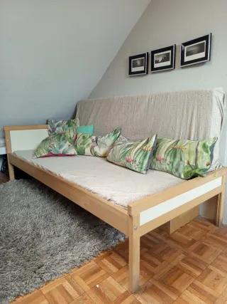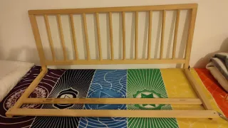 Cama de transición de IKEA, ideal para habitaciones infantiles. - Estructura de madera clara. - Panel frontal blanco. - Somier en perfecto estado - Colchón de espuma sin funda -Posibimudad de adquirir también el colchón que está puesto en vertical y la convierte en un sofá Está en muy buen estado, ver fotos. Solo hay un ligero cambio de color en la parte baja de las patas, debido al roce con el agua y la fregona