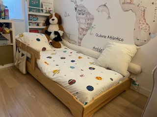 Cama infantil de madera de pino, estilo Montessori. - Estructura de madera natural barnizado - Diseño bajo para facilitar el acceso comprada hace en noviembre de 2024 por 150€. Ha sido una cama súper cómoda pero necesitamos otra cama nido. Por eso la cambiamos. Incluimos la barrera