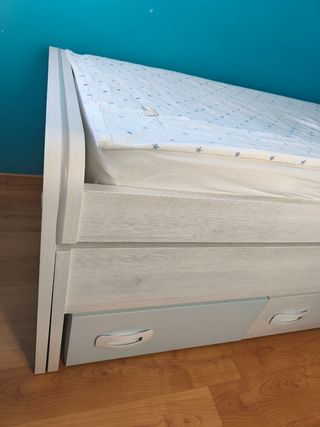 Se vende cama individual Ikea Malm de 90 cm. Incluye somier de láminas y dos cajones. - Estructura de cama blanca. - Somier de láminas de madera. - Dos cajones de almacenaje. - Medida: 90 cm. Se entrega desmontada excepto los cajones
