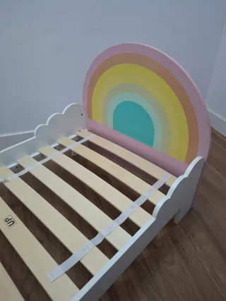 Cama infantil de madera ZONEKIZ con diseño de arcoíris. Diseño bajo que facilita que los niños suban y bajen de la cama sin dificultad. Paneles laterales elevados que actúan como barreras de seguridad. Dimensiones totales: 143x74x66 cm (largo x ancho x alto). Apta para niños de 3 a 6 años. Hecha de MDF y tablero multicapa, con una capacidad de carga de 80 kg. Sin usar.
