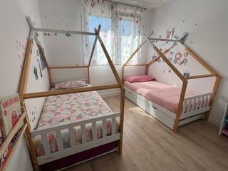 Se venden dos camas infantiles con diseño de casita, perfectas para habitaciones de niños. Cada cama mide 190 cm de largo. - Estructura de madera y blanco. - Incluye cajones de almacenaje y somier para cama de debajo. - Diseño tipo tienda de campaña. - Sólo 2 años de uso. Por separado 250€ cada cama.