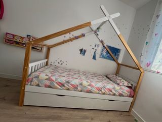 Preciosa cama infantil con diseño de tipi, ideal para habitaciones de niños. - Medidas: 90x160cm. - Estructura 95X1,65cm - Altura 1,50cm - Estructura de madera blanca. - Está nueva, usada 2 veces. - - - -Colchón intacto. -Regalo funda colchón.