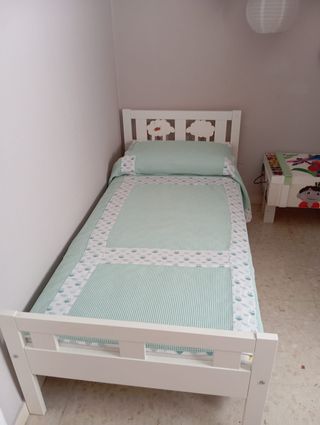 Cama infantil de madera IKEA - Medidas: 70x160 cm. - Estructura de madera con somier de lamas. - Colchón, protector del colchón, sabana bajera, almohada y funda nordica reversible.