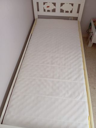 Cama extensible de Ikea en color blanco en buen estado, ideal para habitaciones infantiles o juveniles. Incluye colchón con dos extensiones para poder poner la cama en tres tamaños. Se adapta al crecimiento del niño. - Medidas: 80 x 200 cm. - Estructura de madera lacada en blanco. - Somier de lamas. - Colchón incluido.
