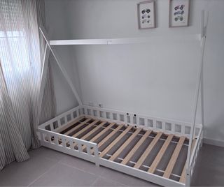Cama infantil con un diseño único en forma de casita, ideal para crear un espacio de ensueño. - Estructura de madera. - Color gris neutro. - Colchón incluido. - Almohada incluida. Se vende por mudanza, mi sobrina solo se ha dormido ahí para ver YouTube en su tablet 3 veces contadas. Está todo nuevo.
