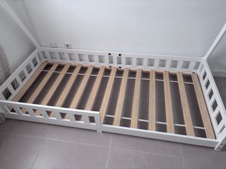 Cama estilo Montessori, ideal para fomentar la autonomía. - Estructura de madera natural. - Diseño bajo para fácil acceso. - Marco de seguridad. • Tamaño: - Altura: 140 cm. - Largo: 200 cm. - Ancho: 100 cm. Sirve para colchón de 90x190 No tiene apenas uso.