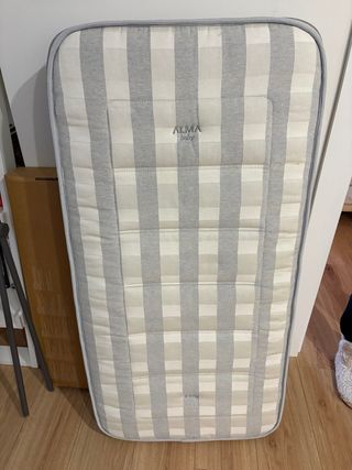 Colchón para cuna de la marca Alma Baby con un diseño a cuadros en tonos grises y blancos. En perfecto estado por uso en segunda residencia. Estdo 10/10. Precio de venta en internet: 179,90€. - Diseño a cuadros. - Marca: Alma Baby.