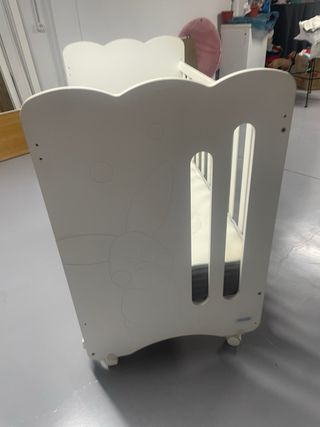 Cuna de bebé en color blanco, con un diseño infantil y protector. Tiene un cajón. Sin usar. Si la quieres con el colchón son 70 euros más. - Barreras de seguridad. - Protector de cuna con dibujos de ovejas. - chichonera y colcha se venden aparte.