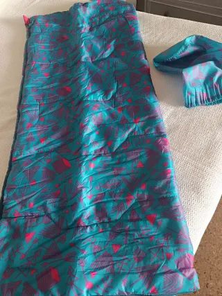 Saco de dormir con un divertido estampado de motivos naturales en tonos turquesa y fucsia. Perfecto para aventuras al aire libre. - Diseño reversible. - Cierre de cremallera lateral.