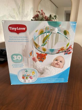 Móvil musical para cuna de la marca Tiny Love. Ideal para entretener al bebé. - Diseño con animales y elementos de la naturaleza. - Colores alegres y llamativos. - Con música. Usado menos de un més. Como nuevo, sin marcas de uso. Un regalo perfecto. Precio original: 55€