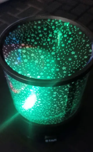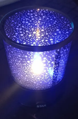 Proyector de estrellas para techo con luz multicolor. Crea un ambiente mágico. - Proyecta estrellas y puntos. - Múltiples colores de luz. - Posición de luz led neutra, posición multicolor intermitente simultáneas - Pilas incluidas - Diámetro 9 cm y altura 12 cm.