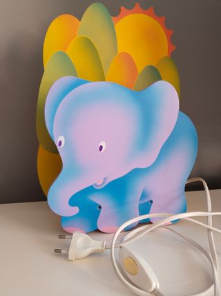 Adorable lámpara infantil con un diseño de elefante azul y morado, acompañado de un paisaje de montañas y sol. - Diseño colorido y tierno. - Ideal para la habitación de los más pequeños.