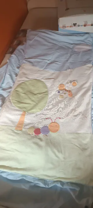 Conjunto de ropa de cuna con un tierno diseño. Es un nórdico desenfundable para poder lavar. Hay 2 almohadas, incluyo una toquilla , sábanas y una manta de pelo suave. El conjunto lleva también el protector de la cuna para los barrotes. Está en su caja , aunque la caja no se ve nueva. - Tonos pastel y alegres. - Tejido suave y agradable.