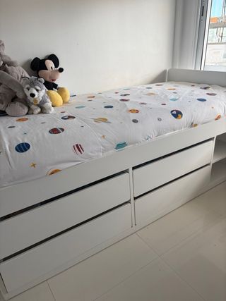 Estructura de cama infantil en color blanco, con práctico sistema de almacenaje integrado. - Cajones amplios para guardar juguetes y ropa. - Estante lateral para libros o decoración.