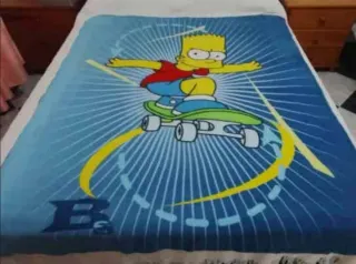 Manta de Bart Simpson con un diseño divertido y vibrante. Perfecta para añadir un toque de color a cualquier habitación. - Medidas: 130x166cm. - Diseño de Bart Simpson sobre un monopatín. - Fondo azul con detalles radiales y amarillos.