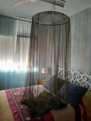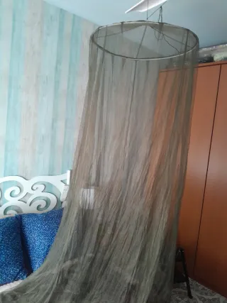 Mosquitera de color verde oscuro, ideal para camas individuales o pequeñas. Su diseño permite colgarla fácilmente desde el techo. - Material de malla fina. - Diámetro del aro superior: 60 cm. - Altura: 240 cm.