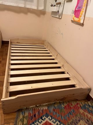 Somier de madera para cama de 90 x 190 cm de estilo Montessori, comprado en Muebles Lufe. Ideal para fomentar la autonomía. - Fabricado en madera natural. - Diseño bajo y seguro. - Base de listones para colchón. Tiene alguna marca de artista de 2 años. Lijando se iría fácil. Se vende montada o desmontada, como prefiráis. Nueva cuesta casi 100€ como se aprecia en la ultima foto.