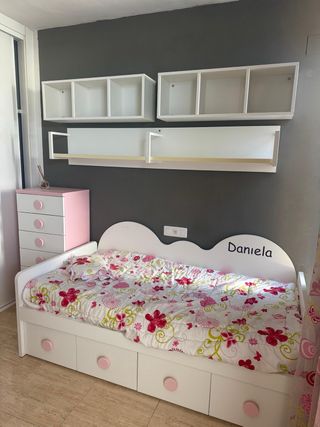 Conjunto de muebles para habitación infantil. - Cama blanca con detalles rosas en el cabecero. - Cómoda blanca con cajones rosas. - Estanterías blancas de pared.