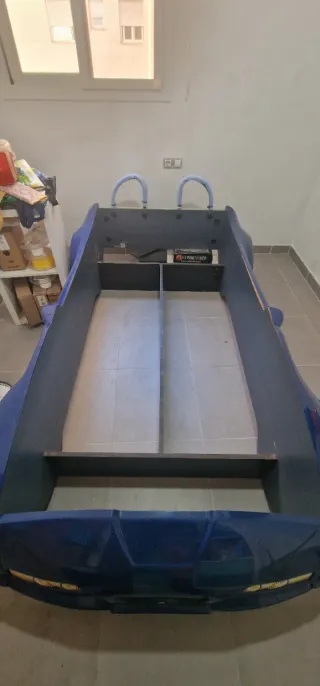 Divertida cama infantil con diseño de coche deportivo en color azul. Ideal para los más pequeños. - Diseño de coche deportivo. - Color azul brillante. • Tiene las puertas rotas, pero apenas se nota y no molestan. URGE LA VENTA POR CAMBIO DE DORMITORIO.