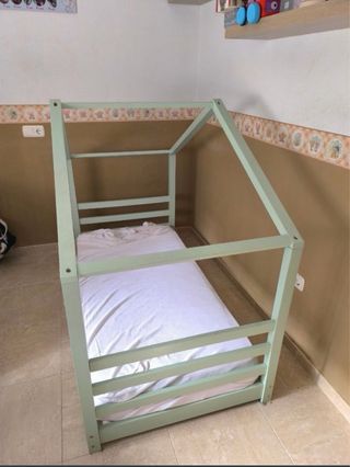 Cama infantil de estilo Montessori, ideal para fomentar la autonomía. - Estructura de madera natural. - Diseño bajo para fácil acceso. - Perfecta para habitaciones infantiles. Si te interesa el colchón y ropa de cama, puedes preguntar y llegamos a un acuerdo.