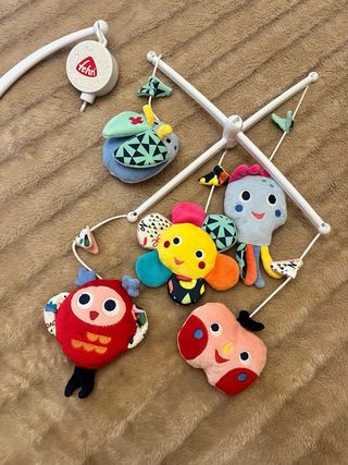 Móvil de cuna con divertidos peluches de animales y formas. - Colores vivos y diseños alegres. - Con fijación a la cuna - Apto para bebés de 0 a 5 meses